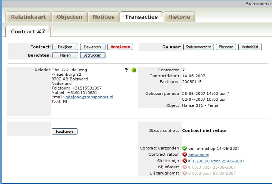 Status contract laat de statussen zien van deze boeking; je kunt zo per individuele opdracht het hele verloop nagaan. Het Statusoverzicht is het omgekeerde: het zet alle opdrachten bij elkaar in dezelfde status: zo kun je de acties coördineren en op tijd uitvoeren. Als ze zijn uitgevoerd verdwijnen die uit het SO, maar onder “Status contract “ blijven ze staan – of liever: het resultaat van die acties is als informatie te zien.