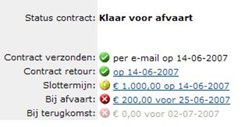 NB. De workflow in het statusoverzicht moet op tijd worden doorlopen. Daarom hebben de acties (terugzenden contract, aanbetalen, verdere betalingen) een termijn, die in het contract en/of de factuur worden genoemd. Als een termijn wordt overschreden kleurt de statusregel rood; u kunt dan desgewenst ingrijpen. In het andere “statusoverzicht”, de Vertrek- & Aankomstlijsten, heeft rood geen functie: de datum van vertrek en aankomst is immers de basis, dus wordt het meteen duidelijk waneer een klant niet op komt dagen.