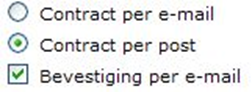 - Bevestigd: deze datum wordt automatisch geregistreerd in Status contract op het moment dat de aanvraag wordt opgeslagen als een contract, maar alléén als is aangevinkt dat het contract per post moet worden verzonden én de bevestiging per email moet geschieden. De volgende status wordt nu beschikbaar.