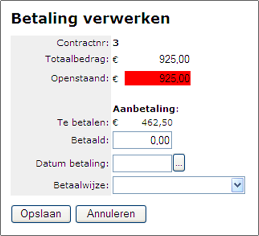 - Aanbetaling niet voldaan: u klikt deze status aan als u de aanbetaling hebt ontvangen en vult het scherm “Betaling verwerken” in, waardoor het icoontje groen wordt, met een datum en het bedrag erbij. Als het betaalde bedrag afwijkt van het te betalen bedrag, dan wordt het verschil verrekend met de volgende termijn. De status zal dan niet groen worden, maar geel:
