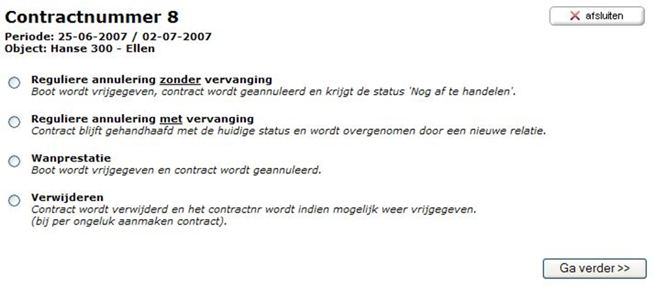 Er is nog een status in het Statusoverzicht mogelijk: - Geannuleerd, nog niet afgehandeld: indien het contract wordt geannuleerd maar nog niet is afgehandeld (zie onder Annuleren). Ook hier geldt dat wanneer het contract is afgehandeld het naar het archief verdwijnt.