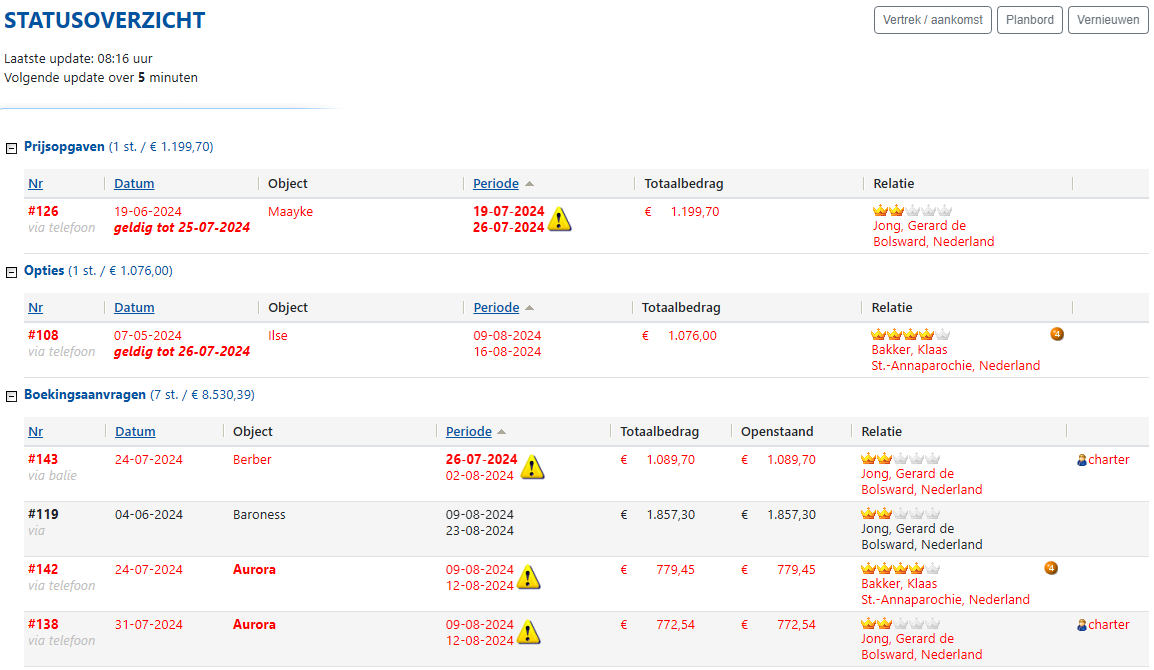 In het Statusoverzicht hierboven zijn vier problemen gesignaleerd, te zien aan het uitroepteken achter de huurperiode. Als u met de muis op het uitroepteken gaat staan, dan wordt het conflict getoond. Behalve dat een aanvraag (gedeeltelijk) dubbel kan zijn, is het ook mogelijk dat een startdag en/of de einddag reeds voorbij zijn (dit zal weinig voorkomen). Zie de prijsopgaaf en eerste boekingsaanvraag in bovenstaand voorbeeld. De betreffende datum is dan rood en vet gedrukt. Bij de twee laatste aanvragen gaat het om een dubbele aanvraag, omdat hier de objectnaam rood en vet gedrukt is; in combinatie met de het attentieteken betekent de kleur rood hier dus niet dat er een termijn is overschreden. Als een aanvraag wordt aangeklikt dan verschijnt de melding ook in het aanvraagformulier. Zie uitleg in het artikel Planbord – Prijsopgaven, opties, aanvragen en contracten bekijken en/of bewerken.