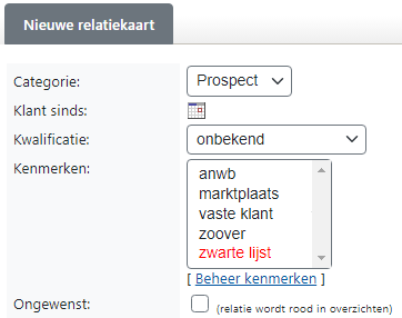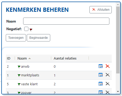 U ziet bij sommige relaties in het Statusoverzicht en in het aanvraagformulier of het contractformulier een vlaggetje staan. Dit betekent dat er op de relatiekaart één of meerdere kenmerken zijn aangebracht (zwarte lijst, vaste klant, enz.); als u met de muis op het vlaggetje gaat staan ziet u om welke kenmerken het gaat. Een groen vlaggetje geeft positieve kenmerken weer, een rood vlaggetje negatieve kenmerken. Ook deze kenmerken kunt u definiëren en instellen via de [ Beheer kenmerken ] in de Relatiekaart.