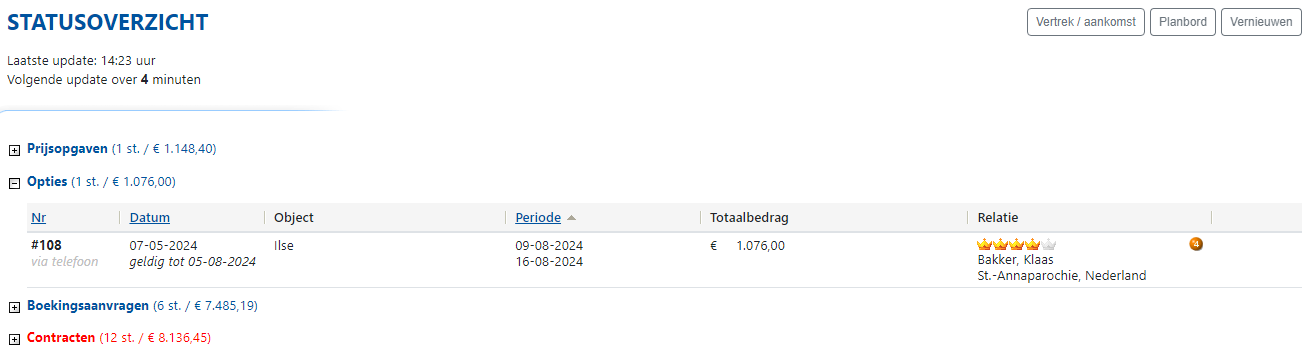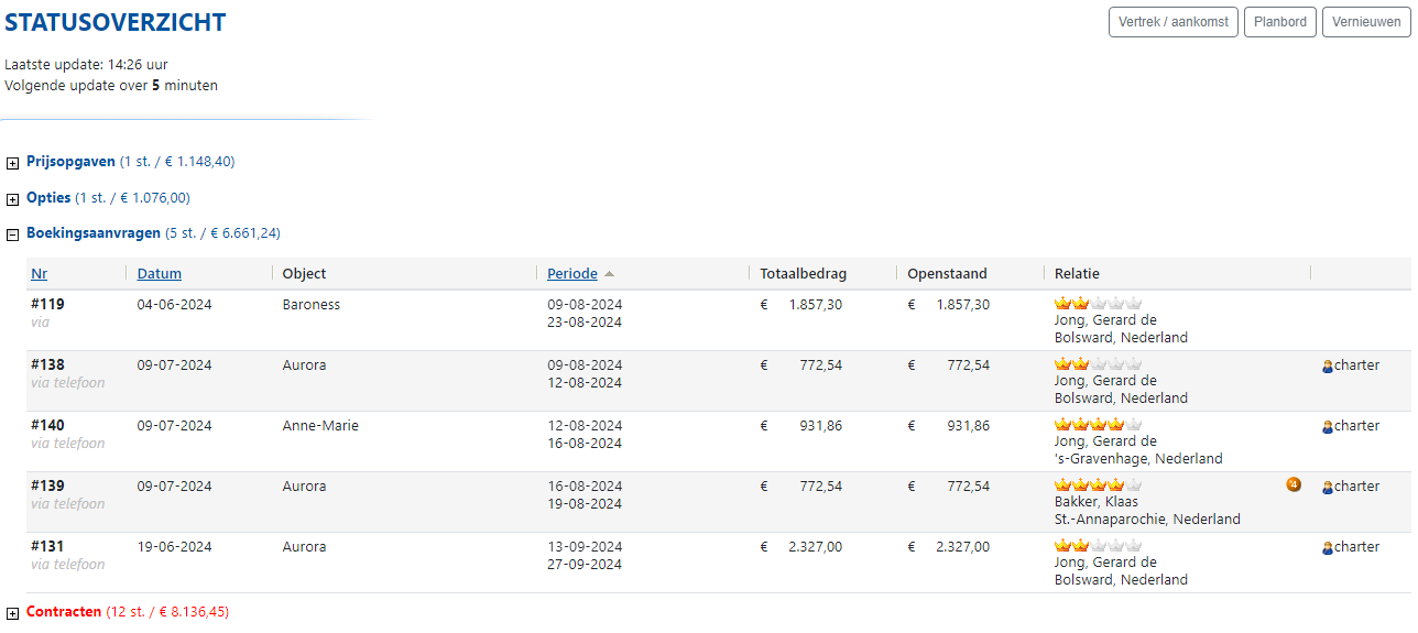 Het statusoverzicht is met de Vertrek- & Aankomstlijsten het onderdeel dat u helpt alle prijsaanvragen, opties, boekingsaanvragen en lopende contracten van A-Z te beheren. U kunt in één oogopslag zien wat de statussen zijn van de aanvragen en contracten. Vanuit het statusoverzicht kunt u direct toegang krijgen tot specifieke aanvragen en contracten.